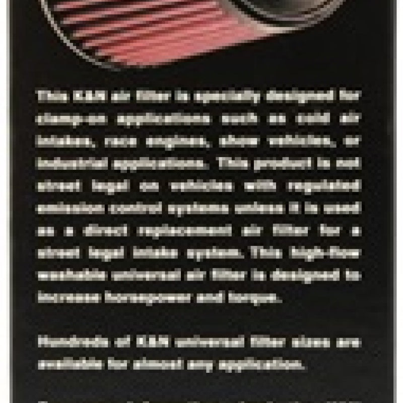 K&N's Universal Air Filters are designed and manufactured for a wide variety of applications including racing vehicles, radio-controlled cars, generators, snowmobiles, tractors, and other applications. Regardless of the angle or offset diameter of the air intake, there is probably a K&N Universal air filter for your equipment. All filters are constructed with ultra-strong molded pliable rubber flanges which absorb vibration and allow for secure attachment and can also be stretched for up to 1/16 of an inch (1.5mm) to fit in-between sizes. K&N universal air filters are washable and reusable.