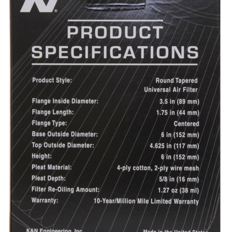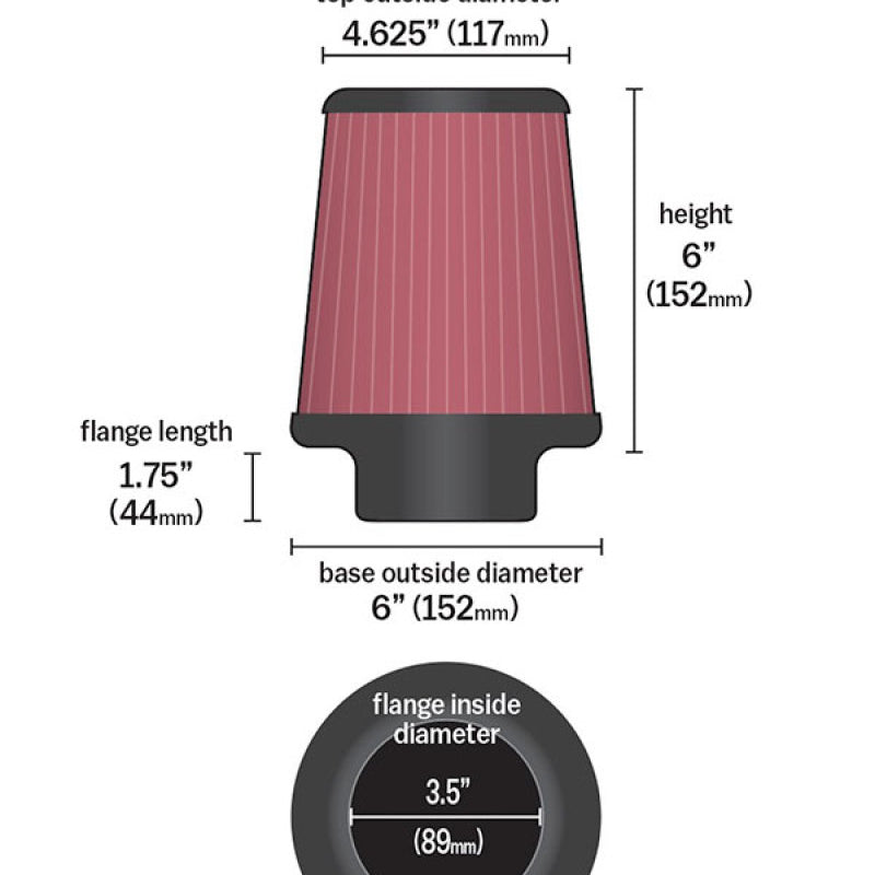 K&N Universal Rubber Filter 3 1/2inch ID FLG / 6inch Base / 4-5/8inch Top / 6inch Height