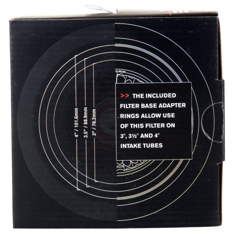 This Spectre High Performance Racing (HPR) Air Filter is a black media clamp-on cone air filter that can be used for a wide variety of applications. Using the included adapter rings, this filter can fit 3 inch, 3-1/2 inch, and 4 inch diameter tubes. Manufactured using high quality materials throughout, including oiled synthetic media, urethane, and steel mesh, this washable performance filter is precision engineered for low restriction and better performance. This filter's top houses an inverted cone filter for improved service life and enhanced flow potential. Designed with a triple chrome plated steel top and base, this 5-1/2 inch tall air filter is factory pre-oiled and ready to use.