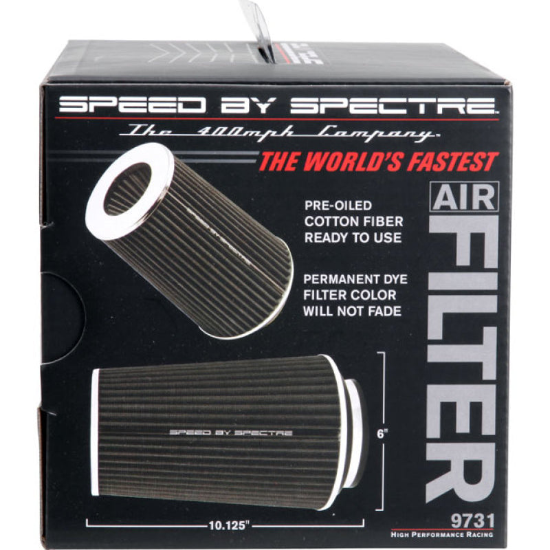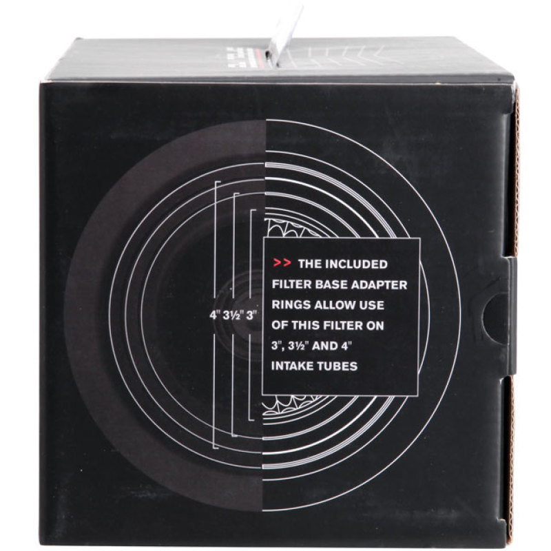 This Spectre High Performance Racing (HPR) Air Filter is a black media clamp-on cone filter that can be used for a wide variety of applications. Using the included adapter rings, this filter can fit 3 inch, 3-1/2 inch, and 4 inch diameter tubes. Manufactured using high quality materials throughout, including oiled synthetic media, urethane, and steel mesh, this washable performance filter is precision engineered for low restriction and better performance. This filter's top houses an inverted cone filter for improved service life and enhanced flow potential. Designed with a triple chrome plated steel top and base, this 9-1/2 inch tall air filter is factory pre-oiled and ready to use.