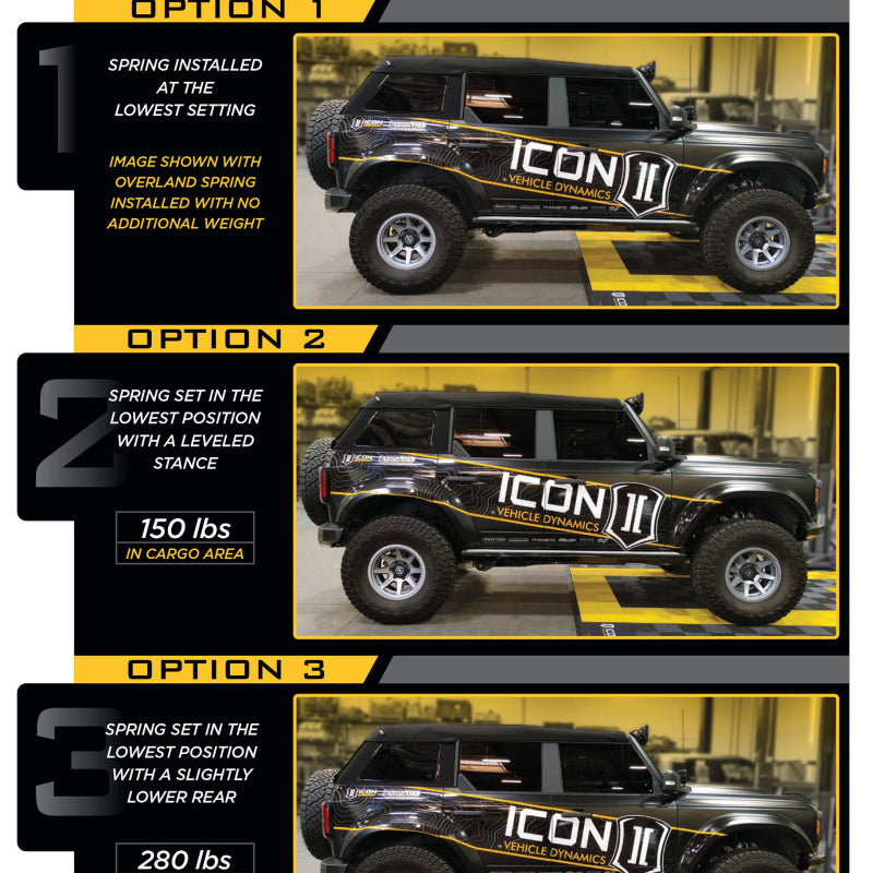ICON Vehicle Dynamics V.S. 2.5 Series remote reservoir rear coilover shocks are an incredible upgrade for the rear end of the 2021-2023 Ford Bronco. These adjustable coilovers allow up to 2-3” of rear lift height adjustability on 4-door Broncos without the Sasquatch package or 1.25-2.25” of rear lift over stock 4-door Sasquatch equipped Broncos, allowing the use of larger, more aggressive wheel and tire combinations. ICON’s Vehicle-specific shock length and valving along with the larger 2.5” shock body and increased piston area over stock components yield the maximum travel possible along with superior ride quality and suspension performance both on- and off-road. Reservoirs greatly increase shock oil volume and heat dissipation surface area to resist overheating and cavitation under hard use, which can lead to damper fade. These rear coilovers are mounted in a shaft up orientation and feature unique ICON engineered progressive dual rate coil springs that provide extra weight capacity for those who frequently load out their Broncos with extra gear and equipment while maintaining excellent on- and off-road performance characteristics. This shaft up orientation also requires the reservoir hose to be routed along the rear lower links so ICON offers hose bracket options for the OE or ICON tubular links while ICON billet links incorporate this bracketry into their design. When paired with ICON 2.5 Series front coilovers vehicle control will be balanced front to rear, resulting in the best overall driving experience for your Ford Bronco.