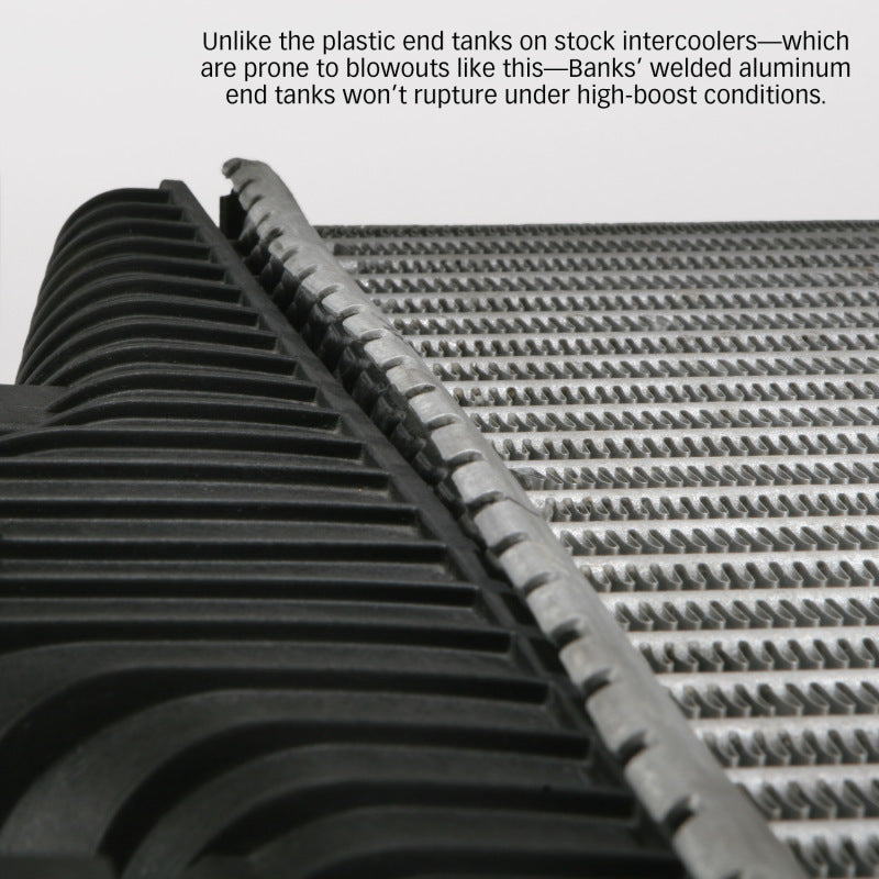 Eliminates restrictions, dramatically increasing the cooling capacity for massive continuous power. Big aluminum end tanks won't burst like stock, with a thicker core for a 21% improvement in volume. Includes mandrel-bent 3.5 inch high-flow boost tubes and super-flow High-Ram intake manifold for maximum performance. Superior to Stock: Everything about Banks Techni-Cooler Intercooler System is designed bigger and better. This upgrade kit includes a set of 3.5 inch high-flow boost tubes and a Banks designed intercooler solution. The Banks Boost Tubes feature over sized mandrel-bent pipes matched to the increased performance design of the new intercooler. The Banks designed intercooler has a 19 percent thicker core with 21 percent greater volume to improve cooling. It also has large high-efficiency all-aluminum end tanks and wide-open inlet / outlets for a 69 percent greater flow area. Lastly to complete the kit, our Banks High-Ram Intake Elbow is also included. The Banks Techni-Cooler dramatically increases the engines cooling capacity and power potential by balancing a richer fuel mixture with cooler, denser, improved airflow. Result: You get higher continuous power and more power at any exhaust gas temp (EGT), with better fuel economy, and lower EGTs. That's a truckload of benefits! It doesn't get any cooler than Techni-Cooler! Mounting hardware included. Key Features: High-efficiency custom-machined durable cast end tanks. Steady power output even under extreme temperatures. Improves Power, Durability and Fuel Economy. 3.5in Boost Tubes Reduces boost pressure loss. Packs cool dense air into the cylinders. Dramatically increases air density. 19% thicker core area vs stock. Includes High-Ram Intake Elbow. Includes all necessary hardware. Cooler EGTs and greater MPG. Lowers exhaust gas temps. 21% larger core volume. 2-year warranty