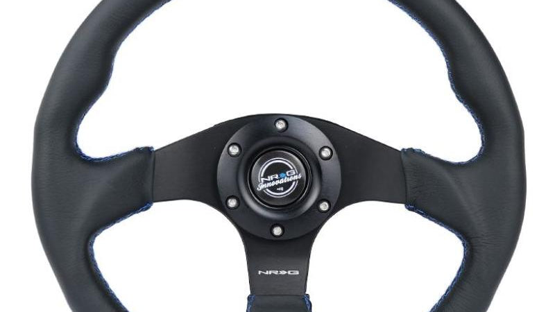 NRG Reinforced Steering Wheel (320mm) Sport Leather Flat Bottom w/ Blue Center/ Blue Stitching