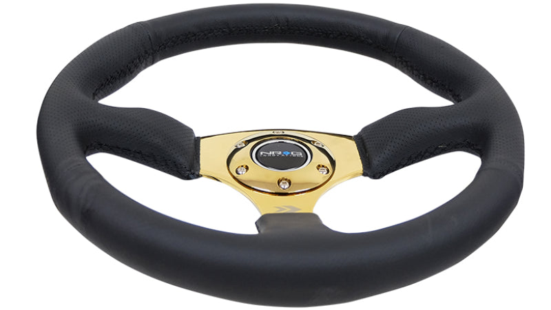 NRG Reinforced Steering Wheel (350mm / 2.5in. Deep) Leather Race Comfort Grip w/4mm Gold Spokes