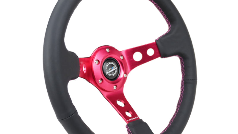 NRG Reinforced Steering Wheel (350mm/3in. Deep) Black Leather/ Fushia Center Mark/ Fushia Stitching