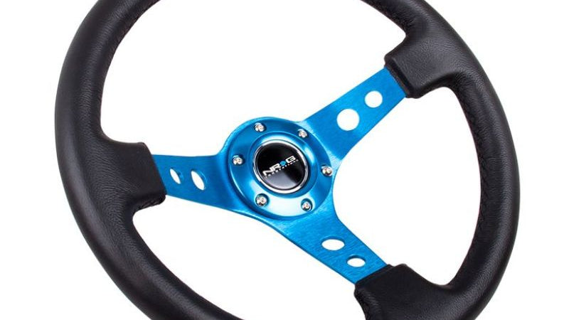 NRG Reinforced Steering Wheel (350mm / 3in. Deep) Blk Leather w/Blue Cutout Spoke & Single Yellow CM