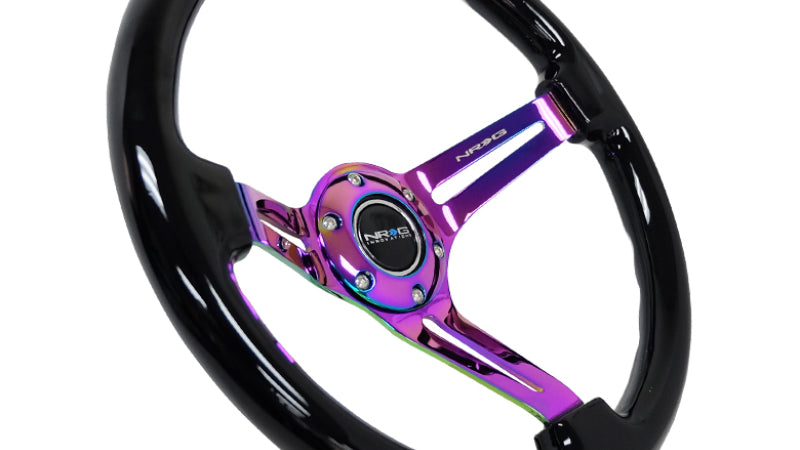 NRG Reinforced Steering Wheel (350mm / 3in. Deep) Blk Leather/Blk Stitch w/Neochrome Slits