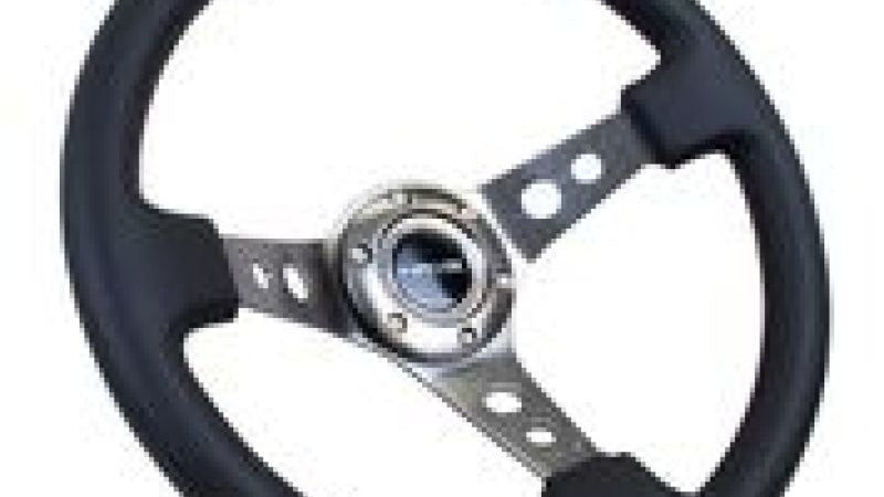 NRG Reinforced Steering Wheel (350mm / 3in. Deep) Blk Leather w/Gunmetal Circle Cutout Spokes
