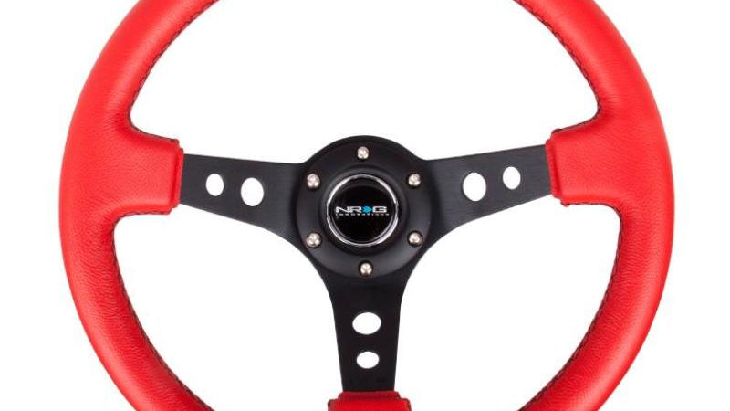 NRG Reinforced Steering Wheel (350mm / 3in. Deep) Red Leather/Blk Stitch w/Blk Spokes (Hole Cutouts)