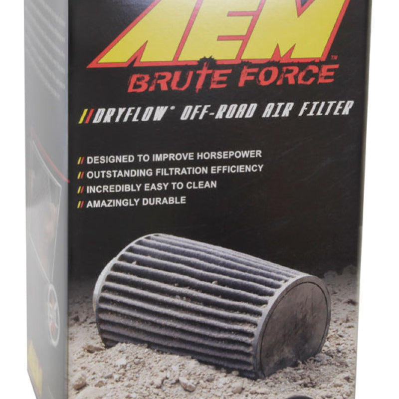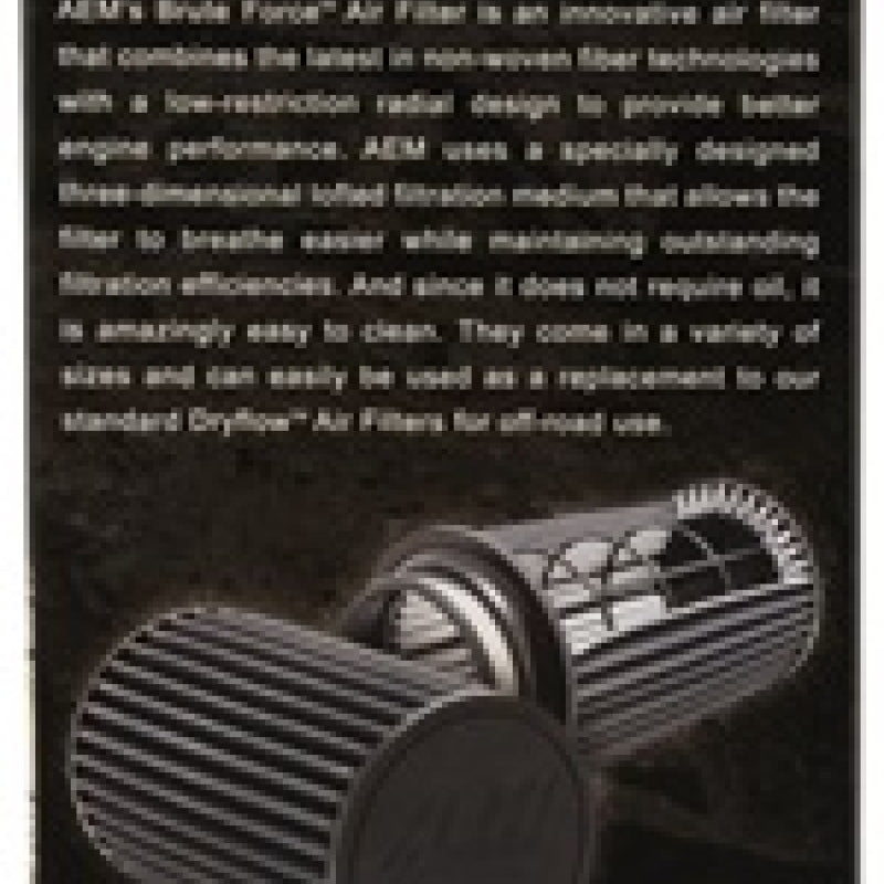 AEM Brute Force Dryflow Air Filters are specially designed for tough off-road applications. They provide outstanding levels of filtration efficiency and capacity. AEM Brute Force Air Filters are oil-free and their synthetic media is incredibly easy to clean. Even more impressive, they are so durable that they maintain their shape under even severe abuse.